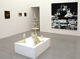Märkligt nog infinner sig genast en likartad stämning som i de förra lokalerna på Riddargatan, vilket möjligen har med hängningsteknken och definitivt med urvalet av konstnärer att göra. Bergman har redan från galleristarten 2002 tydligt markerat sitt intresse för den nya figurationen med dess inslag av graffiti och neonaivism. Där är han tyvärr relativt ensam bland de yngre galleristerna, möjligen med Galleri Loyal undantaget. Men den kyliga bilsalongsestetik som färgar flertalet av de nya gallerierna på Hudiksvallsgatan verkar glädjande nog inte intressera honom.