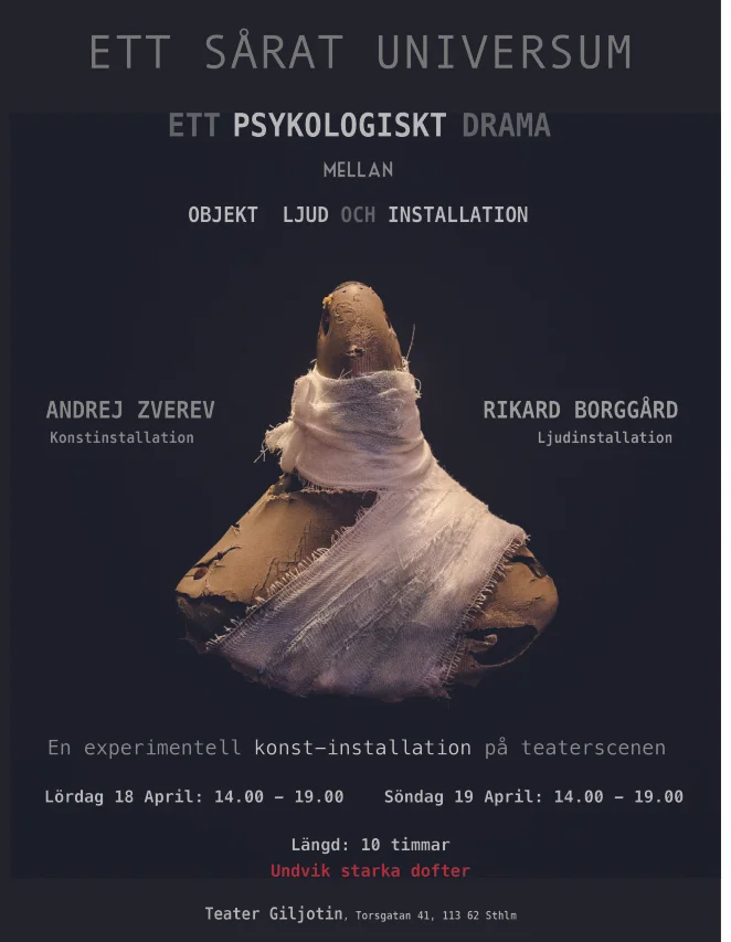 Helgen 18-19 april intar konstinstallationen Ett Sårat Universum av Andrej Zverev Teater Giljotin.
